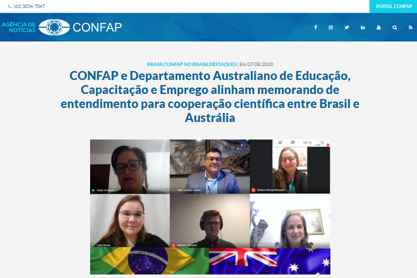 Na tarde de quinta-feira (06/08) no Brasil, e início da manhã de sexta-feira (07/08) na Austrália, representantes do Conselho Nacional das Fundações Estaduais de Amparo à Pesquisa (Confap), do Departamento Australiano de Educação, Capacitação e Emprego (DESE), e da Embaixada da Austrália no Brasil, se reuniram por videoconferência, para alinhar Memorando de Entendimento (MoU) entre as entidades, com a finalidade de realizar o intercâmbio de ações de pesquisa e desenvolvimento entre o Brasil e a Austrália. Na abertura da reunião, o Presidente do Confap, Prof. Fábio Guedes Gomes, resumiu a importante atuação que o Conselho, no conjunto de suas FAPs, têm no país, e compartilhou suas expectativas para a parceria.