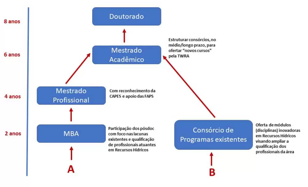 Objetivo: Um dos propósitos da TWRA é oferecer qualificação profissional de alto nível no tema de sua área de atuação que será aqui chamada, para fins de simplificação, de Recursos Hídricos. Nestes termos a TWRA debateu a necessidade de oferecer aos associados e aos profissionais desta área uma formação ao nível de pós-graduação. O diagrama abaixo mostra uma síntese da proposta.