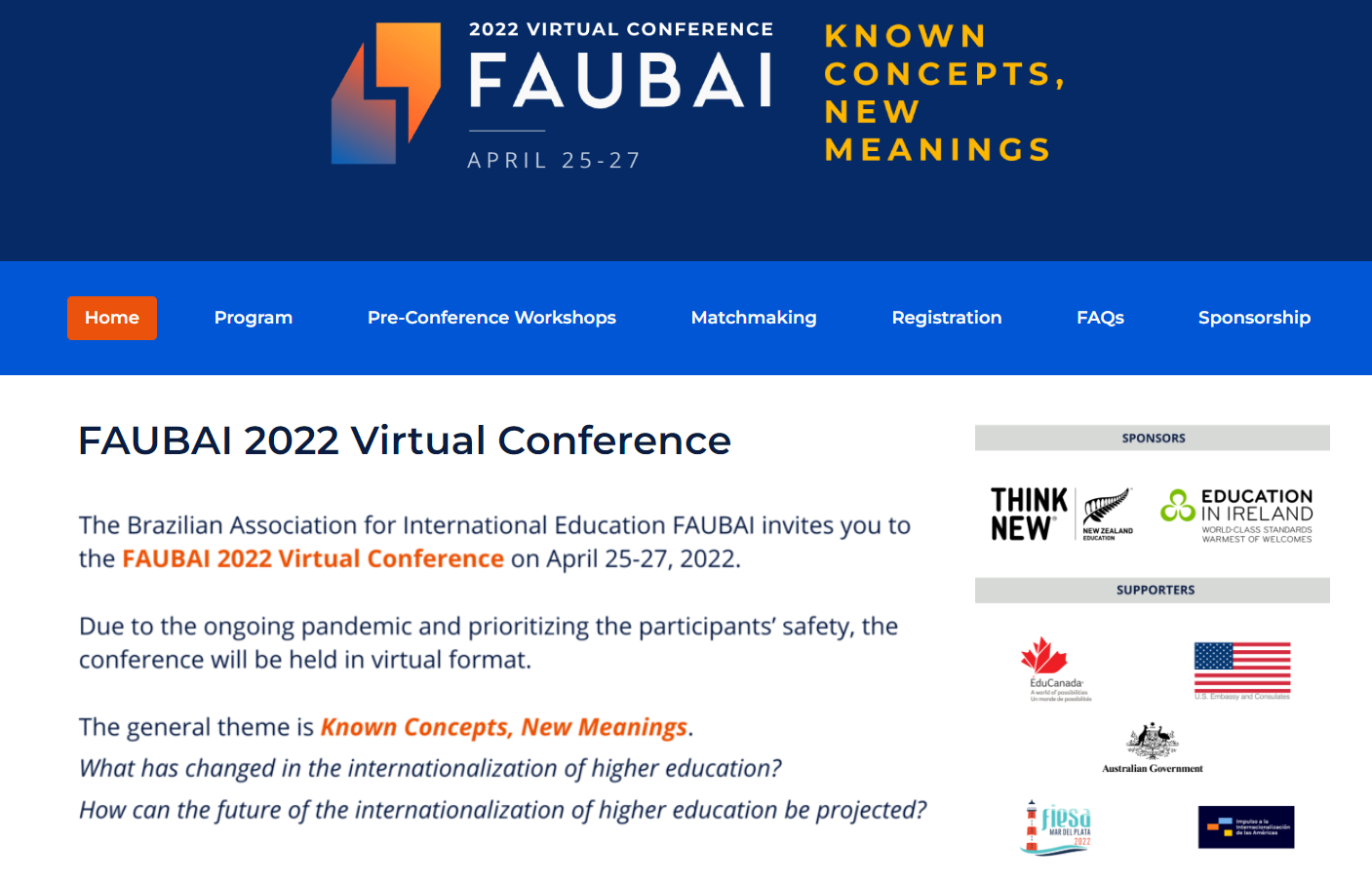 Entre os dias 25 a 27 de abril acontecerá a Conferência anual da FAUBAI (Associação Brasileira de Educação Internacional). A associação atua na divulgação das potencialidades e da diversidade das IES brasileiras, no país e no exterior, junto a IES, agências, representações diplomáticas, organismos e programas internacionais. O tema da Conferência deste ano será “Conceitos conhecidos, novos significados “.