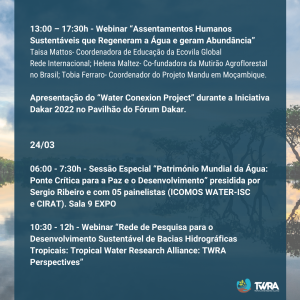 Com imensa alegria e orgulho, divulgamos que no dia 24/03/22 a TWRA participará do 9º Fórum Mundial da Água, em #Dakar (Senegal). O Fórum representa o maior evento sobre a temática no mundo, e a TWRA participará da mesa redonda “Rede de Pesquisa para o Desenvolvimento Sustentável de Bacias Hidrográficas Tropicais: Tropical Water Research Alliance: Perspectivas TWRA”.